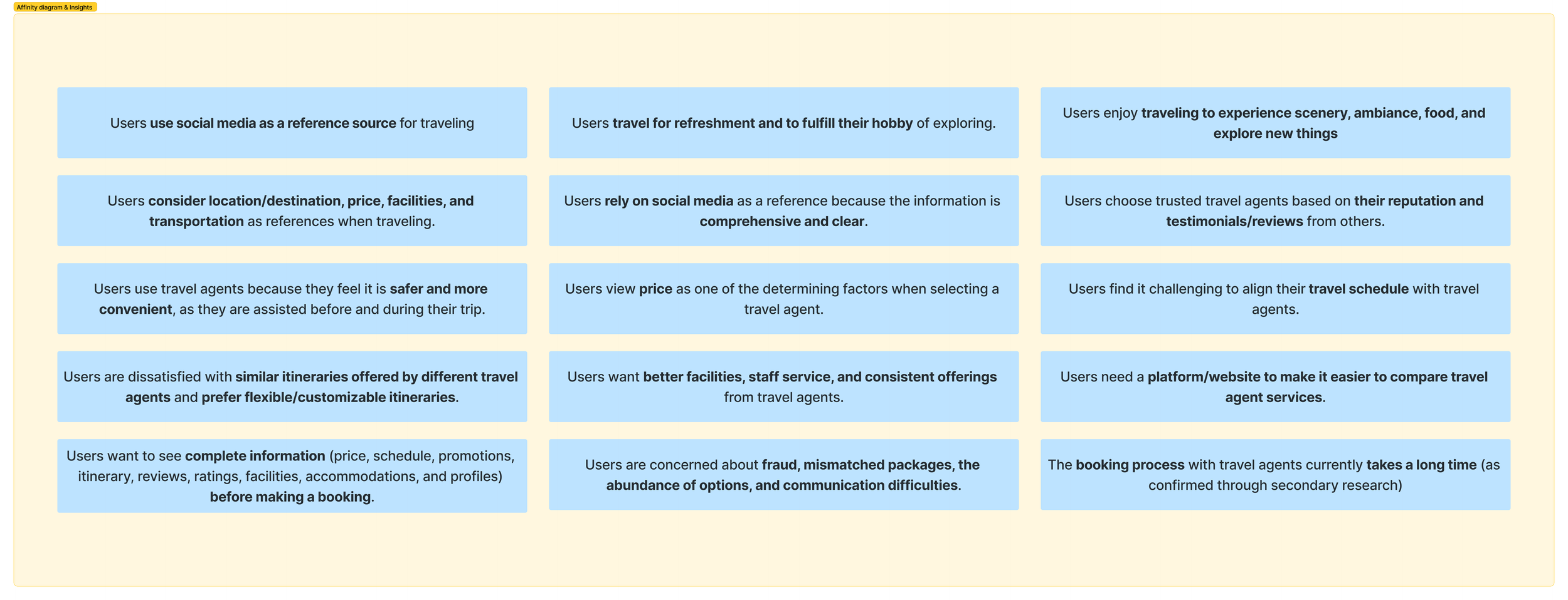 Through this comprehensive process, I have pinpointed user pain points, developed actionable ideas from users, and compiled essential information, all of which are crucial in effectively solving travelers challenges.